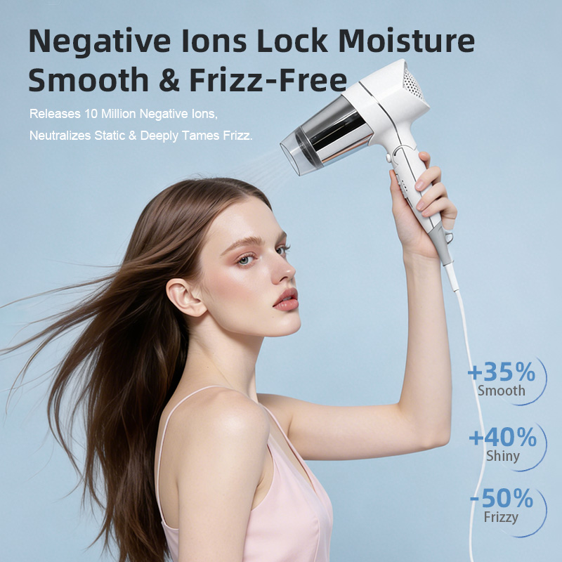 The built-in negative ion function releases up to 10 million negative ions to help reduce static and frizz. For users, this means the hair can feel smoother, softer, and easier to manage after drying.